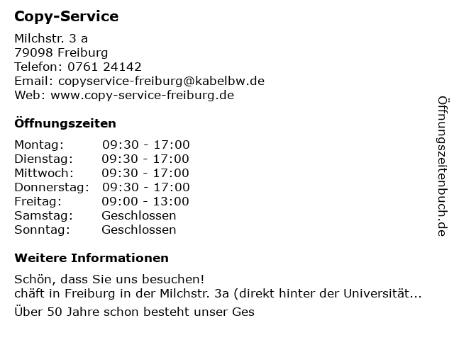 | Öffnungszeiten Copy-Service in Freiburg anzeigen | |