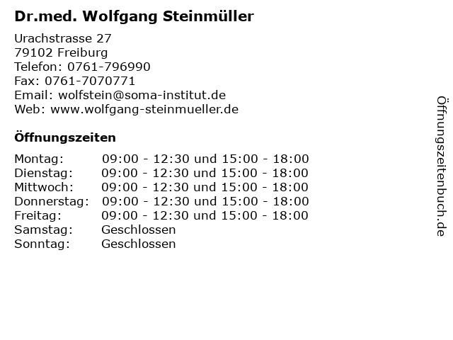 | Öffnungszeiten Dr.med. Wolfgang Steinmüller in Freiburg anzeigen | |