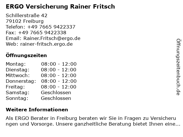2 Dipl.Psych. Rainer Schulte-Lippern Psychologische Psychoterapeuten (Entfernung: 0,10 km) Talstraße 1a, 79102 Freiburg 5 DKV Service-Center seit 1995 und Direktionsgeschäftsstelle der ERGO Group AG (Entfernung: 0,43 km) Insel 16, 79098 Freiburg 6 Horst-Rainer Dietrich Freier Garten- und Landschaftsarchitekt (Entfernung: 0,64 km) Schwimmbadstr. 23, 79100 Freiburg |