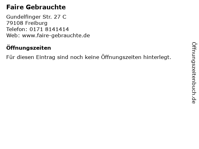 | Öffnungszeiten Faire Gebrauchte in Freiburg anzeigen | |