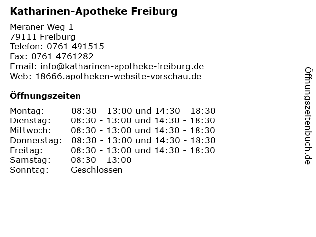 | Öffnungszeiten Katharinen-Apotheke Freiburg in Freiburg anzeigen | |