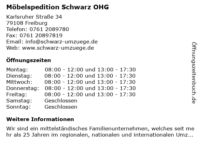 | Öffnungszeiten Möbelspedition Schwarz OHG in Freiburg anzeigen | |