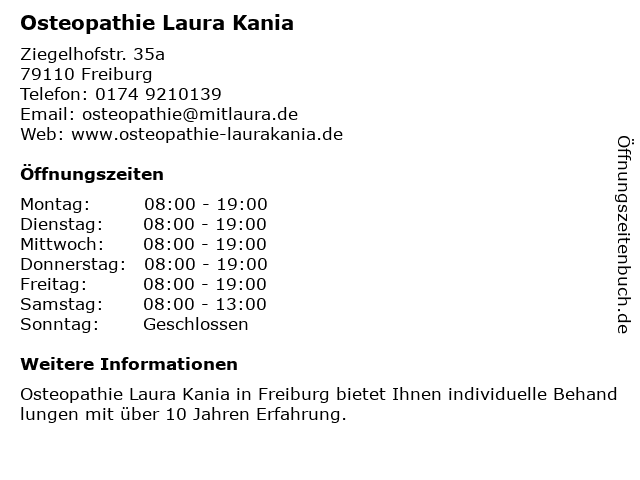 | Öffnungszeiten Osteopathie Laura Kania in Freiburg anzeigen | |