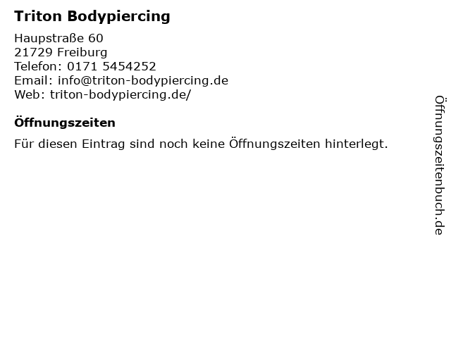 | Öffnungszeiten Triton Bodypiercing in Freiburg anzeigen | |