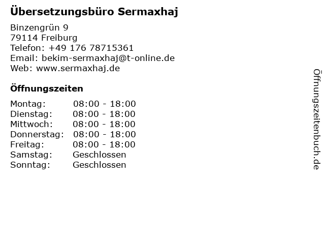 | Öffnungszeiten Übersetzungsbüro Sermaxhaj in Freiburg anzeigen | |