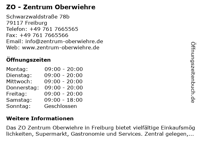 | Öffnungszeiten ZO - Zentrum Oberwiehre in Freiburg anzeigen | |