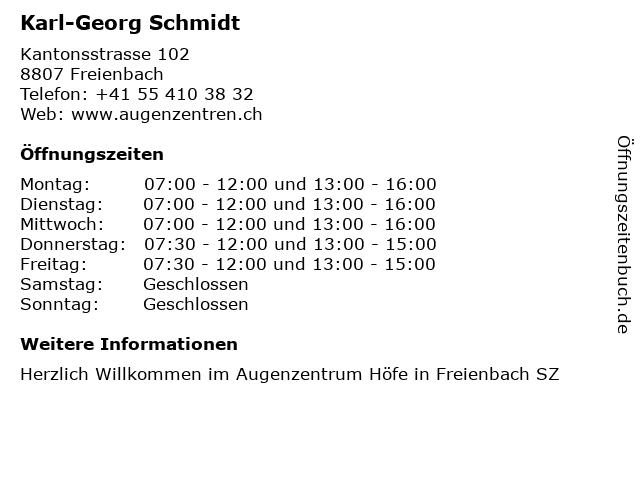 | Öffnungszeiten Karl-Georg Schmidt in Freienbach anzeigen | |
