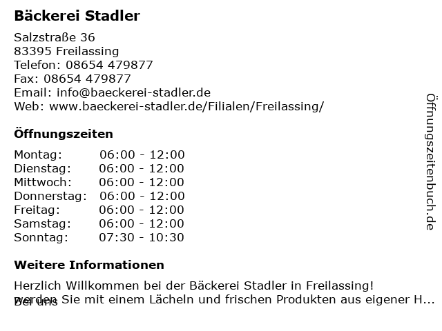 | Öffnungszeiten Bäckerei Stadler in Freilassing anzeigen | |