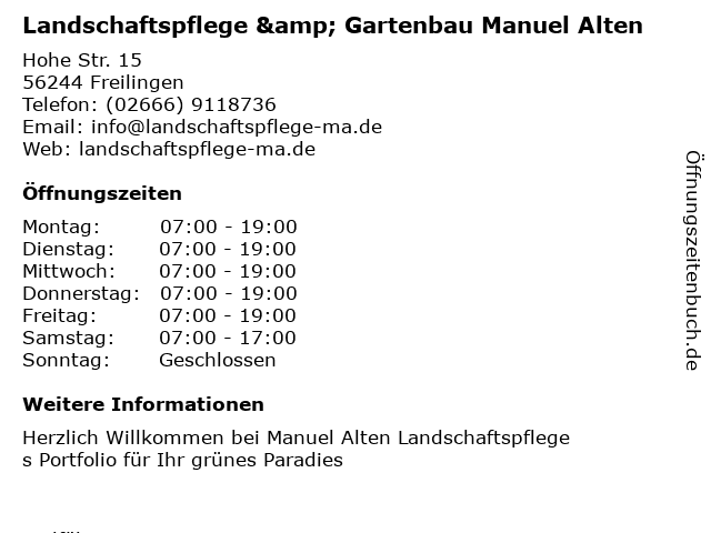 1 Landschaftspflege & Gebäudereinigung Manuel Alten (Entfernung: 0,00 km) Hohe Straße 15, 56244 Freilingen 4 Klaus-Werner Haubrich Gartenbau und Baumschule (Entfernung: 8,97 km) An der L 306 , 56242 Marienrachdorf 6 |