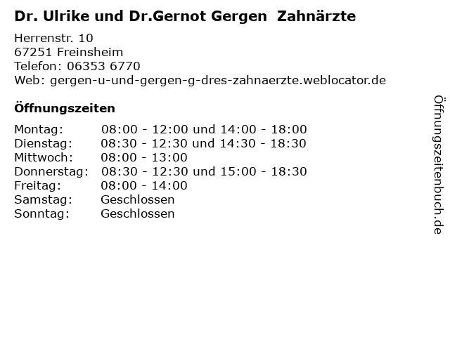 1 Gemeinschaftspraxis Dres. Ulrike Gergen und Gernot Gergen Zahnarztpraxis (Entfernung: 0,01 km) Herrenstr. 10, 67251 Freinsheim 6 |