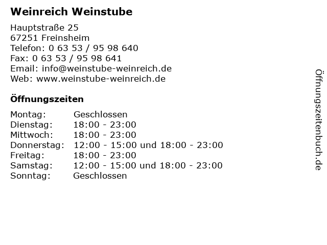 | Öffnungszeiten Weinreich Weinstube in Freinsheim anzeigen | |