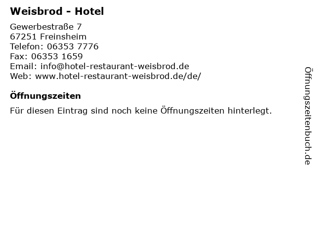 | Öffnungszeiten Weisbrod - Hotel in Freinsheim anzeigen | |