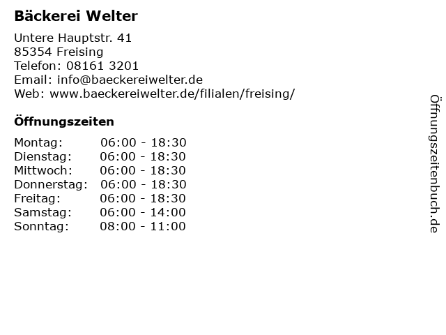| Öffnungszeiten Bäckerei Welter in Freising anzeigen | |