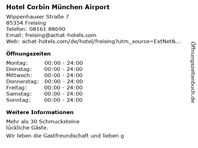 | Öffnungszeiten Hotel Corbin München Airport in Freising anzeigen | |