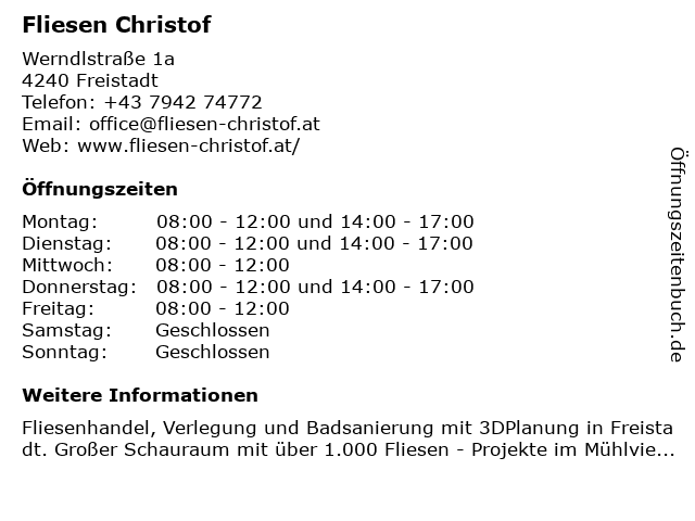 | Öffnungszeiten Fliesen Christof in Freistadt anzeigen | |