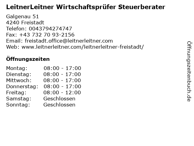 1 Pirklbauer Wirtschaftsprüfung & Steuerberatung GmbH & Co KG (Entfernung: 2,60 km) Badgasse 5, 4240 Freistadt 5 Finanzamt Freistadt Rohrbach Urfahr (FA52) (Entfernung: 38,11 km) Linzerstraße 15, 4150 Rohrbach in Oberösterreich 6 |