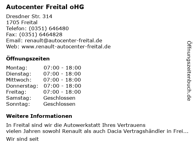 | Öffnungszeiten Autocenter Freital oHG in Freital anzeigen | |