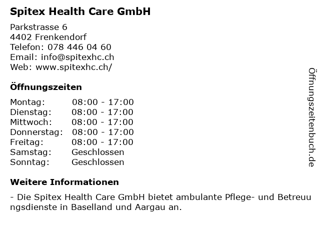 | Öffnungszeiten Spitex Health Care GmbH in Frenkendorf anzeigen | |