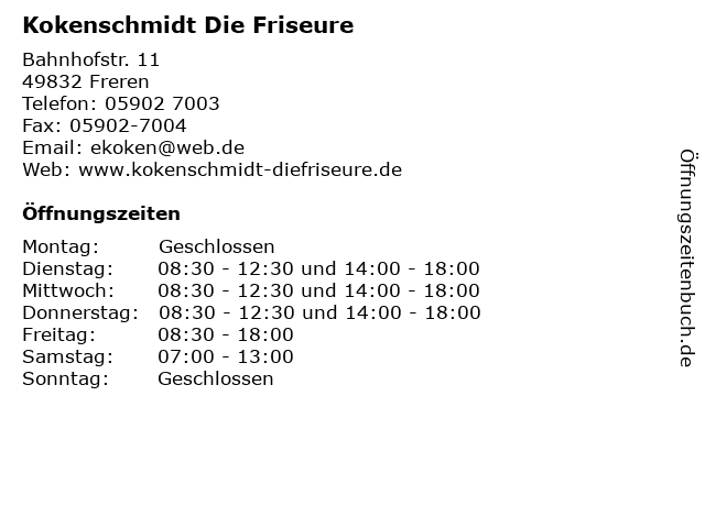 | Öffnungszeiten Kokenschmidt Die Friseure in Freren anzeigen | |