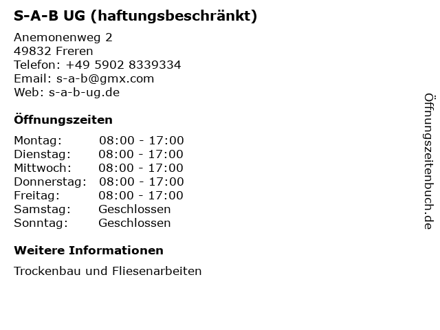 Öffnungszeiten S-A-B UG (haftungsbeschränkt)