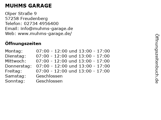 | Öffnungszeiten MUHMS GARAGE in Freudenberg anzeigen | |