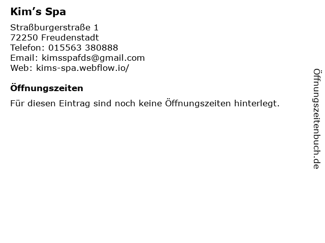 | Öffnungszeiten Kim’s Spa in Freudenstadt anzeigen | |