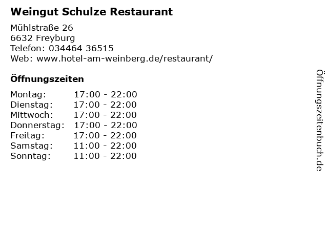 | Öffnungszeiten Weingut Schulze Restaurant in Freyburg anzeigen | |