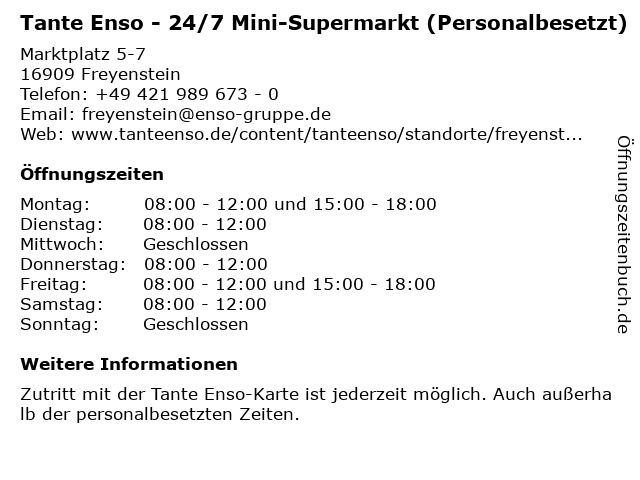 Branchen & Suchbegriffe zu Tante Enso - 24/7 Mini-Supermarkt (Personalbesetzt):24/7, enso, fleisch, gemüse, getränke, lebensmitte, mini, obst, personalbesetzt, supermarkt, tante |