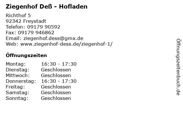 | Öffnungszeiten Ziegenhof Deß - Hofladen in Freystadt anzeigen | |