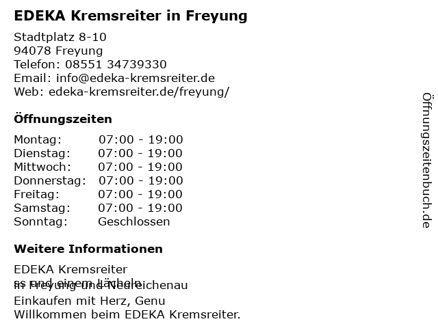 | Öffnungszeiten EDEKA Kremsreiter in Freyung in Freyung anzeigen | |