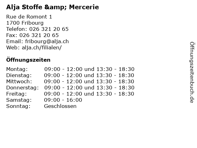 | Öffnungszeiten Alja Stoffe & Mercerie in Fribourg anzeigen | |