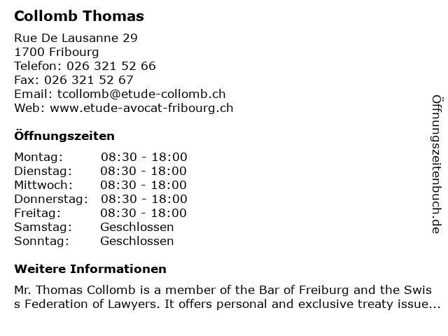 | Öffnungszeiten Collomb Thomas in Fribourg anzeigen | |