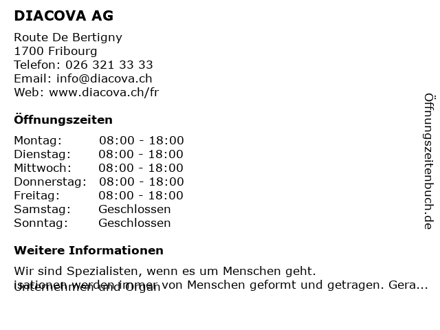 | Öffnungszeiten DIACOVA AG in Fribourg anzeigen | |