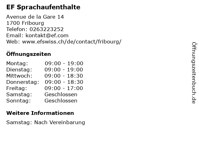 | Öffnungszeiten EF Sprachaufenthalte in Fribourg anzeigen | |