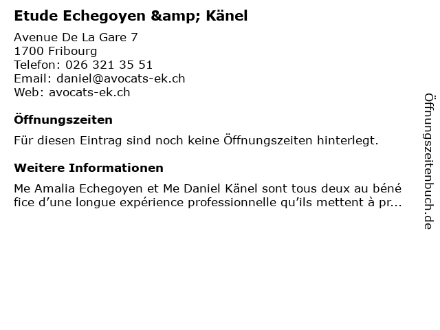 | Öffnungszeiten Etude Echegoyen & Känel in Fribourg anzeigen | |