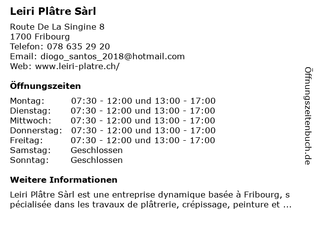 | Öffnungszeiten Leiri Plâtre Sàrl in Fribourg anzeigen | |