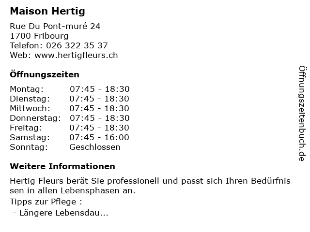 | Öffnungszeiten Maison Hertig in Fribourg anzeigen | |