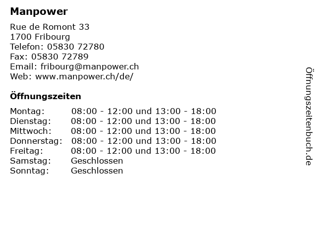 | Öffnungszeiten Manpower in Fribourg anzeigen | |