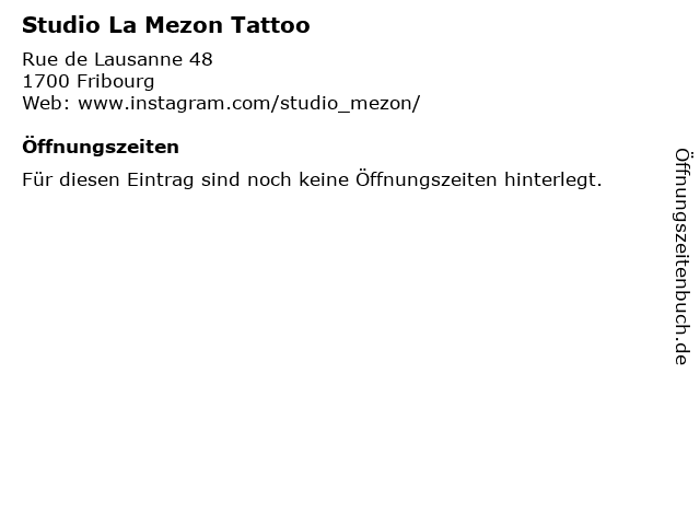 | Öffnungszeiten Studio La Mezon Tattoo in Fribourg anzeigen | |