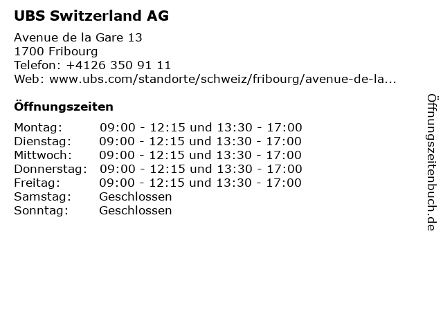 | Öffnungszeiten UBS Switzerland AG in Fribourg anzeigen | |