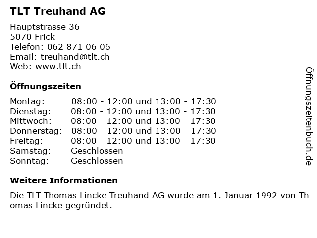 | Öffnungszeiten TLT Treuhand AG in Frick anzeigen | |