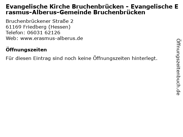 | Evangelische Kirche Bruchenbrücken - Evangelische Erasmus-Alberus-Gemeinde Bruchenbrücken anrufen | |