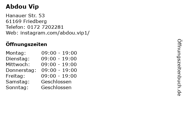 Öffnungszeiten Abdou Vip in Friedberg anzeigen | |