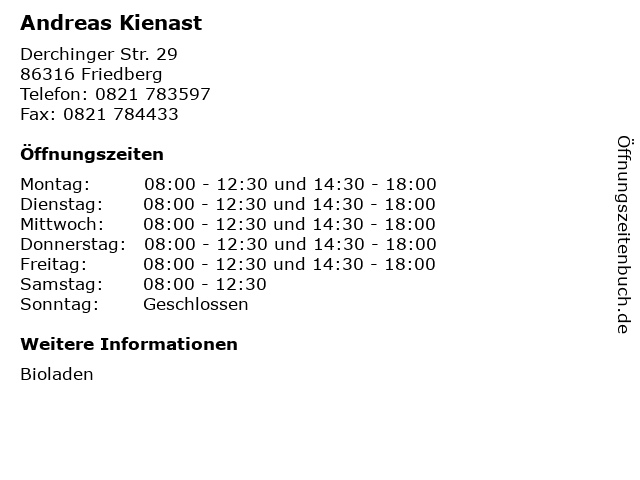 | Öffnungszeiten Andreas Kienast in Friedberg anzeigen | |