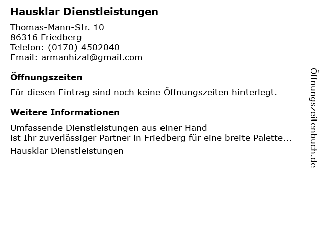 | Öffnungszeiten Hausklar Dienstleistungen in Friedberg anzeigen | |