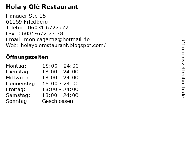 | Öffnungszeiten Hola y Olé Restaurant in Friedberg anzeigen | |