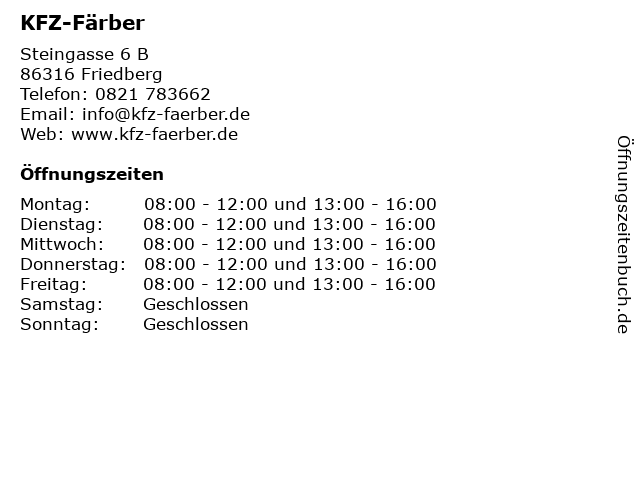 | Öffnungszeiten KFZ-Färber in Friedberg anzeigen | |