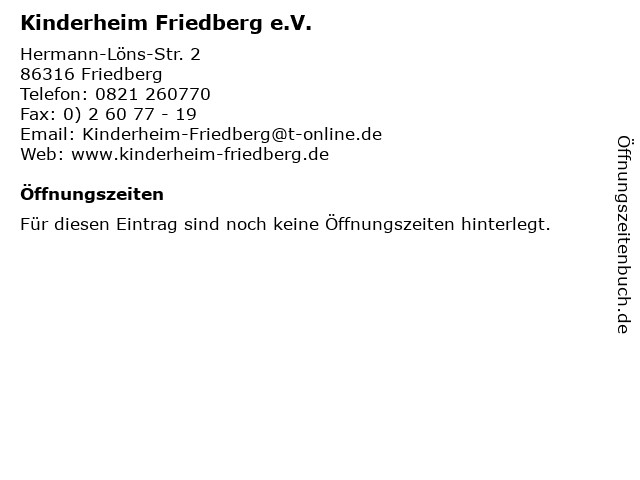 | Öffnungszeiten Kinderheim Friedberg e.V. in Friedberg anzeigen | |