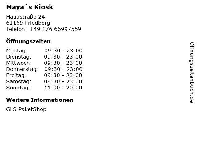 | Öffnungszeiten Maya´s Kiosk in Friedberg anzeigen | |