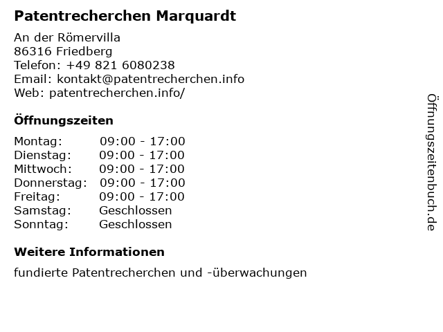 1 Patentrecherchen Marquardt Patentrecherchen (Entfernung: 0,09 km) An der Römervilla 2, 86316 Friedberg, Bayern 4 Galerie und Malstudio Marquardt R u. W Bildergalerie (Entfernung: 35,42 km) Siriusstr. 18 A, 82205 Gilching 6 |